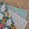 Ils sont en coton bio avec un petit ourlet sur les 4 côtés.Motifs : fleurs/fond vert mint, triangles noirs/fond blanc , taches blanches/fond mint